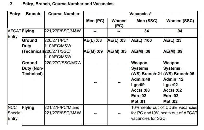 AFCAT EntryEducation12th पास हो और किसी भी विषय में स्नातकोत्तर (PG) में 50% अंक हों (इंटीग्रेटेड PG कोर्स भी मान्य). साथ ही किसी भी विषय में स्नातक (Graduation) में 60% अंक होना आवश्यक है।