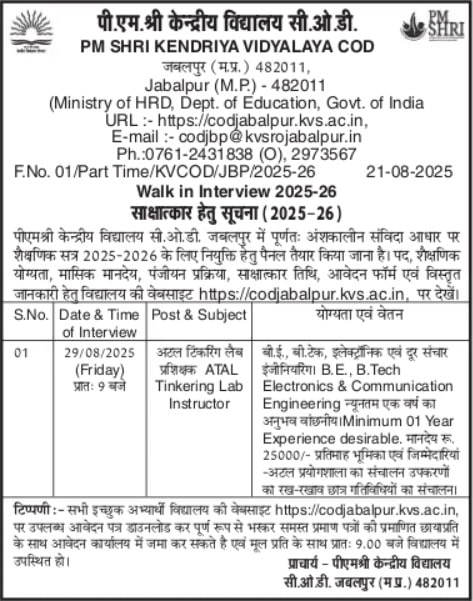 - इंटरव्यू स्थल: पीएम श्री केंद्रीय विद्यालय सीओडी, जबलपुर, जबलपुर क्षेत्र, पीओ- गोकलपुर सीओडी, जबलपुर, पिन – 482010
