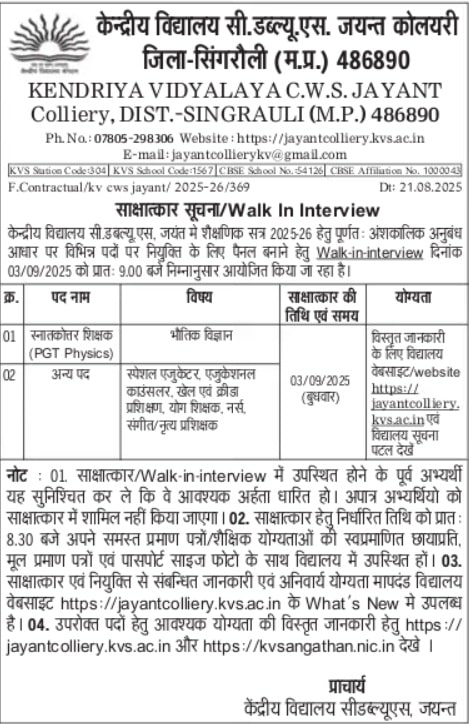 - इंटरव्यू का स्थल: Kendriya Vidyalaya Singrauli CWS Colony , Jayant Colliery, Dist. Singrauli (M.P.) Pin -486890