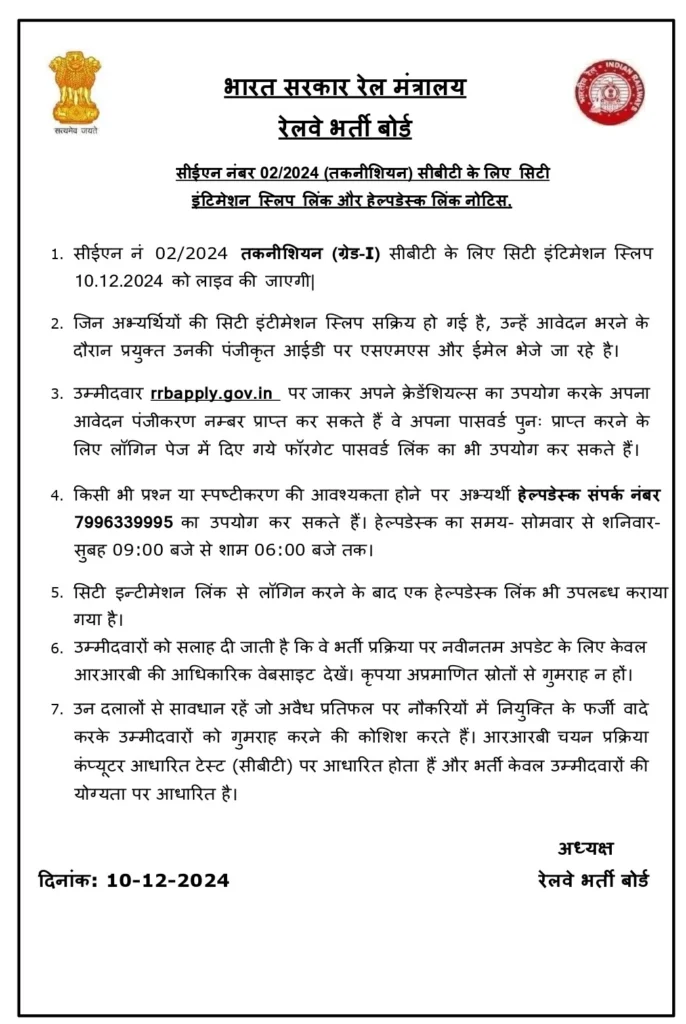RRB Technician Exam City Slip Link 2024: रेलवे भर्ती बोर्ड द्वारा रेलवे टेक्नीशियन भर्ती परीक्षा देखने की लिंक एक्टिवेट कर दी गई है। आवेदक रेलवे की ऑफिसियल वेबसाइट के माध्यम से लॉगिन करके अपना परीक्षा शहर चेक कर सकते है। रेलवे रिक्रूटमेंट बोर्ड द्वारा 10 दिसंबर 2024 को तकनीशियन (ग्रेड 1) की सीटी इंटिमेशन स्लिप लाइव कर दी गई है।