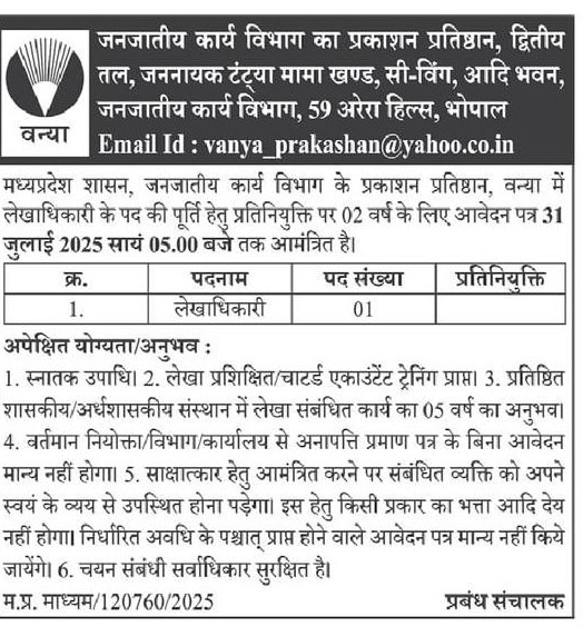 Vanya Recruitment 2025: मध्य प्रदेश जनजातीय कार्य विभाग के प्रकाशन प्रतिष्ठान वन्या में भर्ती के लिए ऑफिसियल नोटिफिकेशन जारी किया गया है। इस भर्ती के तहत आवेदक का चयन प्रतिनियुक्ति पर 02 वर्ष के लिए लेखाधिकारी के पद पर किया जायेगा। योग्य आवेदक इस भर्ती के लिए ऑफलाइन माध्यम से आवेदन कर सकते है। Vanya Recruitment 2025 से सम्बंधित सम्पूर्ण जानकारी आगे विस्तार से दी गई है।