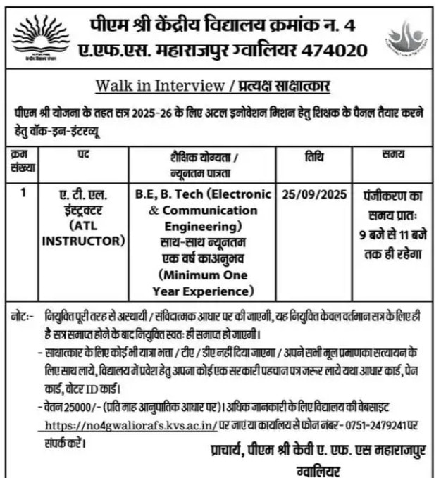 MP KVS No 4 Gwalior Recruitment 2025: मध्य प्रदेश पीएम श्री केंद्रीय विद्यालय क्रमांक 4 ग्वालियर में शैक्षणिक सत्र 2025-26 हेतु ATL इंस्ट्रक्टर के पदों पर संविदा आधार पर भर्ती निकली है। योग्य आवेदक सीधे इंटरव्यू में शामिल हो सकते है। विद्यालय द्वारा इंटरव्यू का आयोजन 25 सितम्बर 2025 को किया जायेगा।
