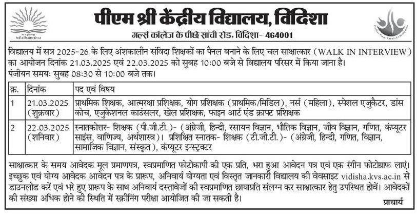 KVS Vidisha Recruitment 2025: केंद्रीय विद्यालय विदिशा में निकली विभिन्न पदों पर भर्ती, इंटरव्यू के द्वारा होगा चयन