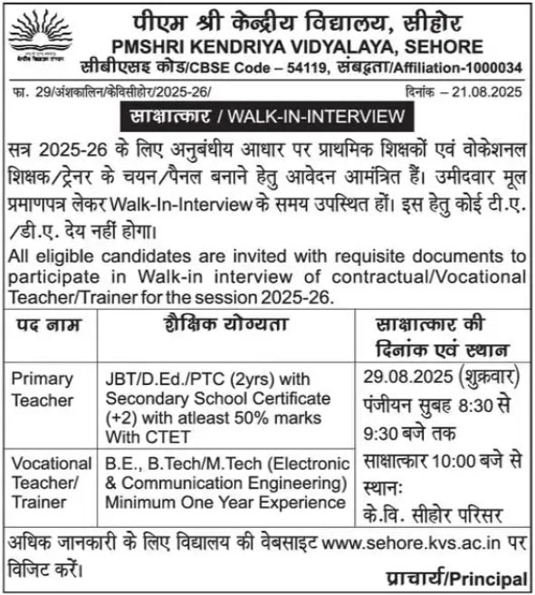 - इंटरव्यू का स्थल: Kendriya Vidyalaya Sehore, Near Professor Colony, Chanakyapuri, Post- Badiyakhedi, Sehore, Madhya Pradesh, Pin – 466001