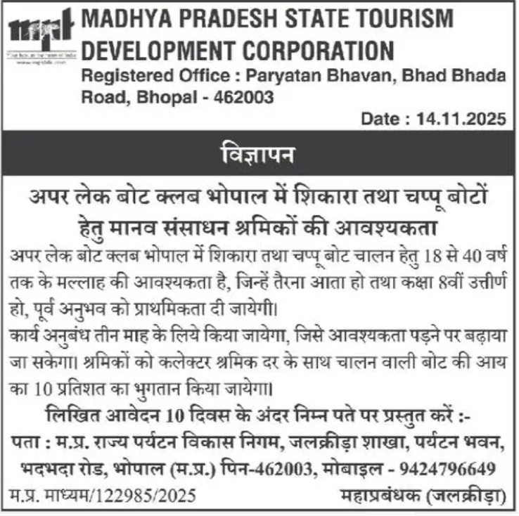 MP Tourism Recruitment 2025: मध्य प्रदेश राज्य पर्यटन विकास निगम, भोपाल द्वारा बोटमेन (नाविक) के पदों पर भर्ती हेतु ऑफिसियल नोटिफिकेशन जारी किया गया है। विभाग द्वारा भोपाल अपर लेक में शिकारा और चप्पू बोट को चलाने के लिए आवेदकों का चयन किया जायेगा। इच्छुक एवं योग्य उम्मीदवार 24 नवंबर 2025 तक आवेदन कर सकते हैं। MP Tourism Vacancy 2025 से जुड़ी सम्पूर्ण जानकारी आगे विस्तार से दी गई है।