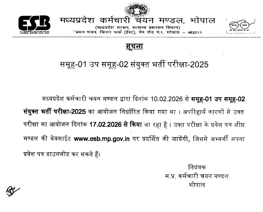 MPESB Group 1 Sub Group 2 Recruitment 2025 के अंतर्गत 474 पदों के लिए परीक्षा का आयोजन किया जा रहा है। आवेदक एप्लीकेशन नंबर और जन्म तिथि के माध्यम से अपना प्रवेश पत्र डाउनलोड कर सकते है। पहले इस परीक्षा का आयोजन 10 फरवरी 2026 से होने वाला था जिसे बढ़ाकर 17 फरवरी 2026 से कर दिया गया है। विभाग द्वारा जारी परीक्षा नोटिस निचे दिया गया है।